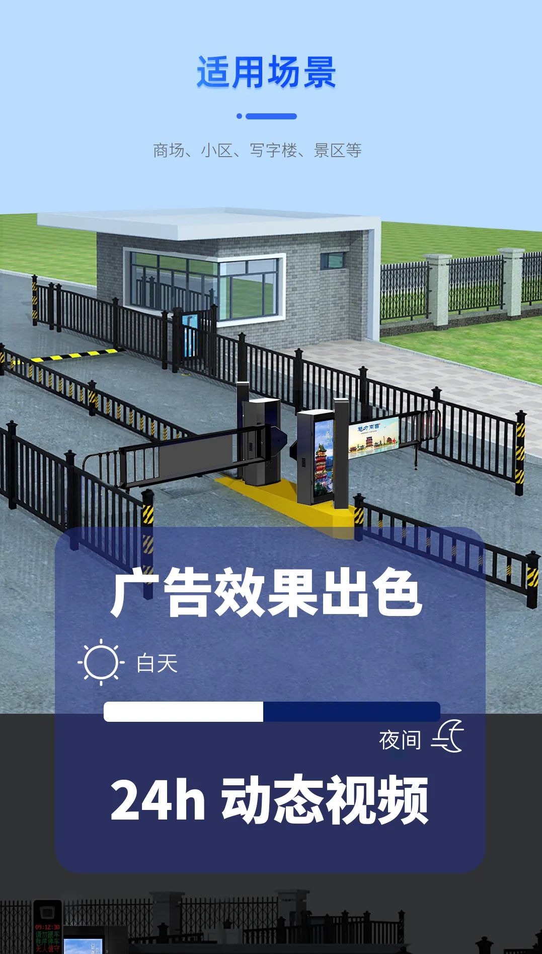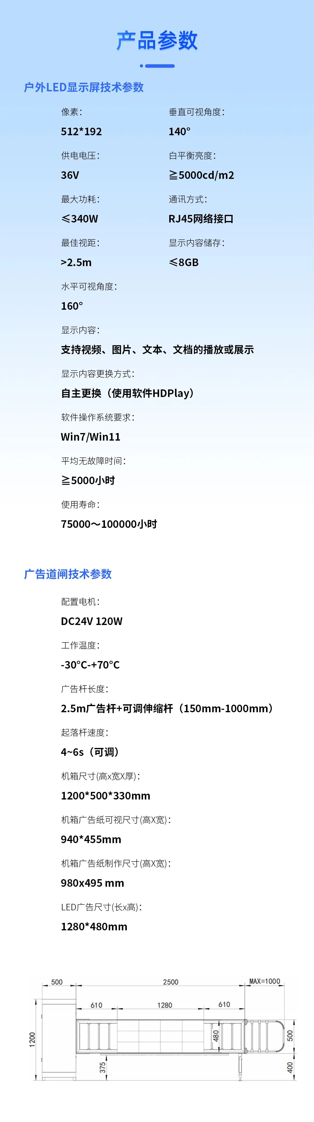 具備遇阻返回、24V安全電壓、電機(jī)抗熱保、抗電涌保護(hù)智能自檢等多重保護(hù)功能,極大提高輕型廣告道閘使用安全性和可靠性。